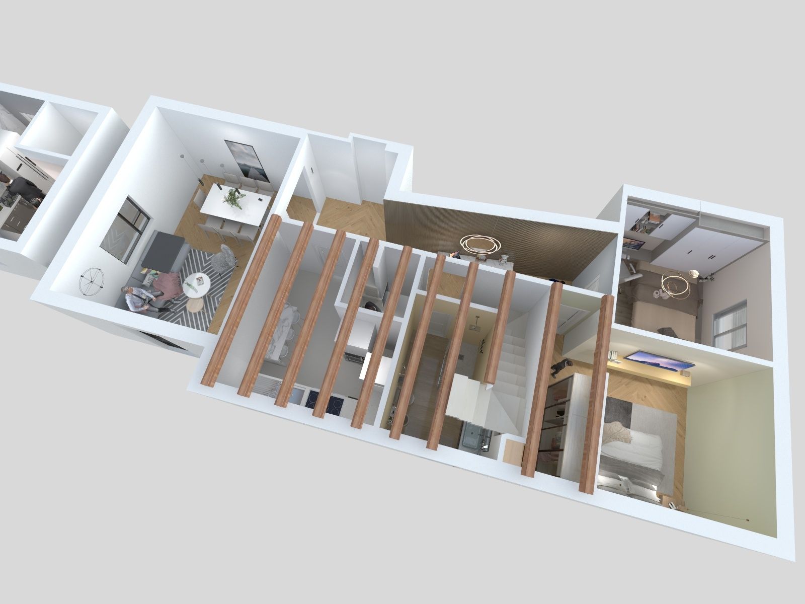 Composto da: ingresso, soggiorno-pranzo con balcone, cucina abitabile, disimpegno, due camere da letto, bagno e soppalco accessibile con scala, da cui ricavare una terza camera da letto ed un secondo bagno.